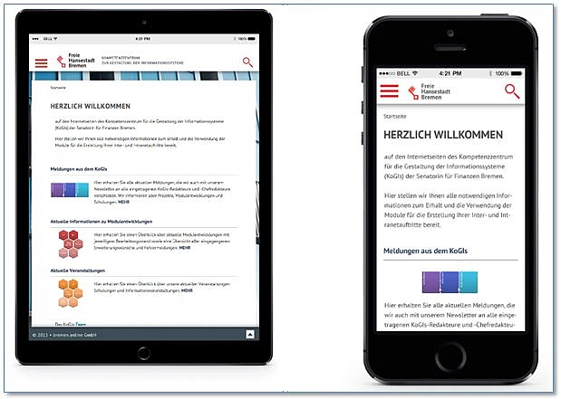 Für alle Internetauftritte werden angepasste Seiten für mobile Endgeräte bereitgestellt. Diese werden dynamisch sichtbar, sobald die Breite des Browserfensters den jeweiligen Schwellenwert unterschreitet.